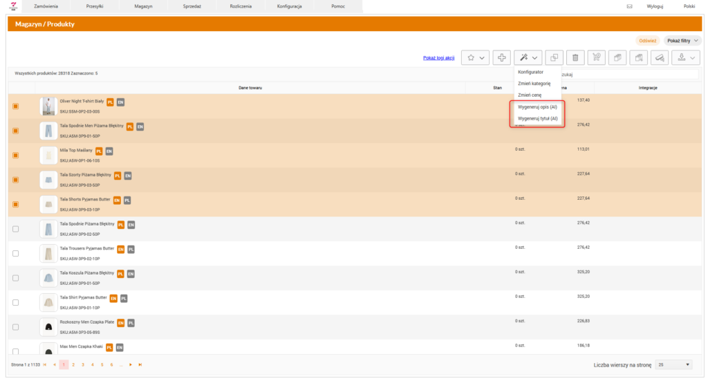 Nowa funkcja generowania tytułów i opisów produktów oraz tytułów ofert w module magazynu / produktów PowerHub to: