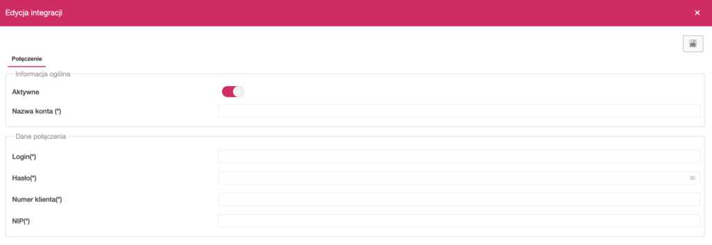 Kliknij ikonę dyskietki w prawym górnym rogu, aby zapisać dane i aktywować połączenie z DB Schenker.