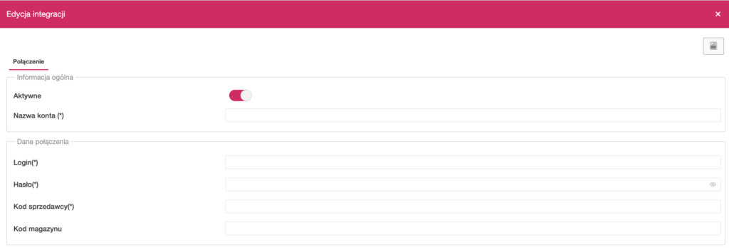 Po uzupełnieniu wszystkich wymaganych pól kliknij ikonę dyskietki w prawym górnym rogu, aby zapisać dane i aktywować integrację.